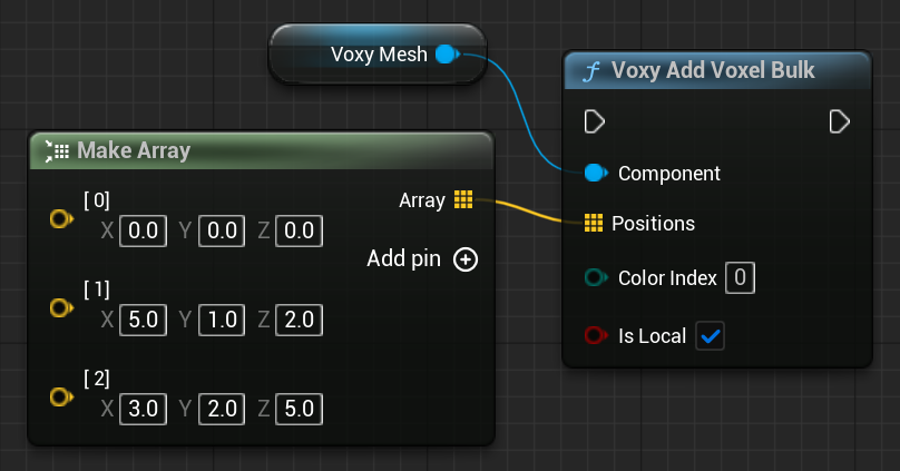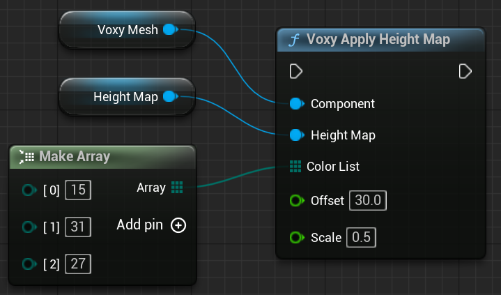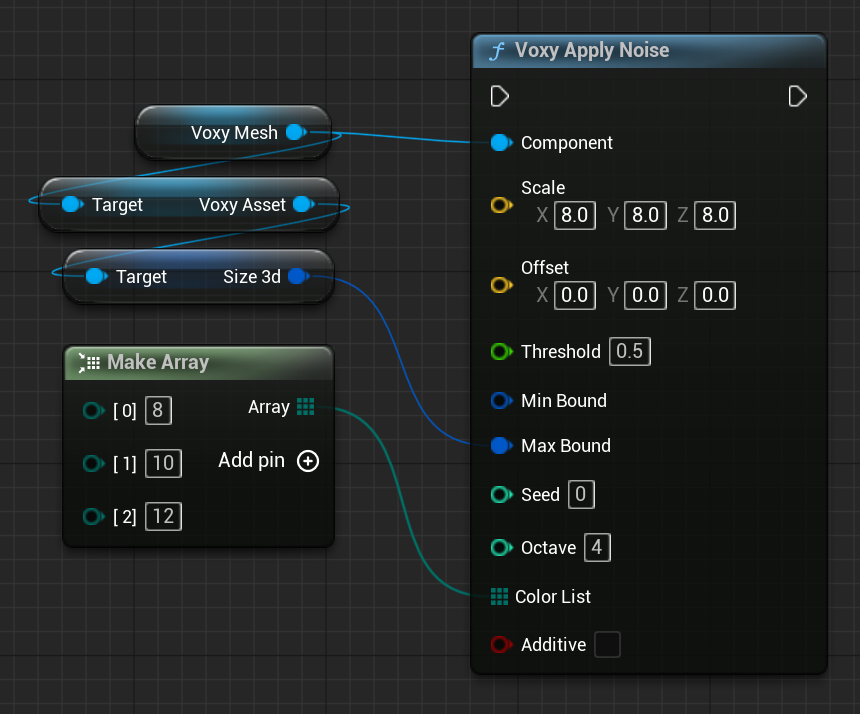 UVoxyMeshComponent* ComponentFVector ScaleFVector Offsetfloat ThresholdFIntVector MinBoundFIntVector MaxBoundint Seedint OctaveTArray<uint8> ColorListbool Additive